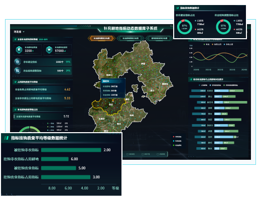 提供補充耕地和占用耕地數據的動態管理,包括指標數據統計、圖斑分布情況及耕地指標及耕地指標掛鉤分布情況